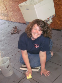 After the grout is done, you have to scrub the tile to make sure that the black grout doesn't stain the gray tile. So, yesterday, the girls were called into action.